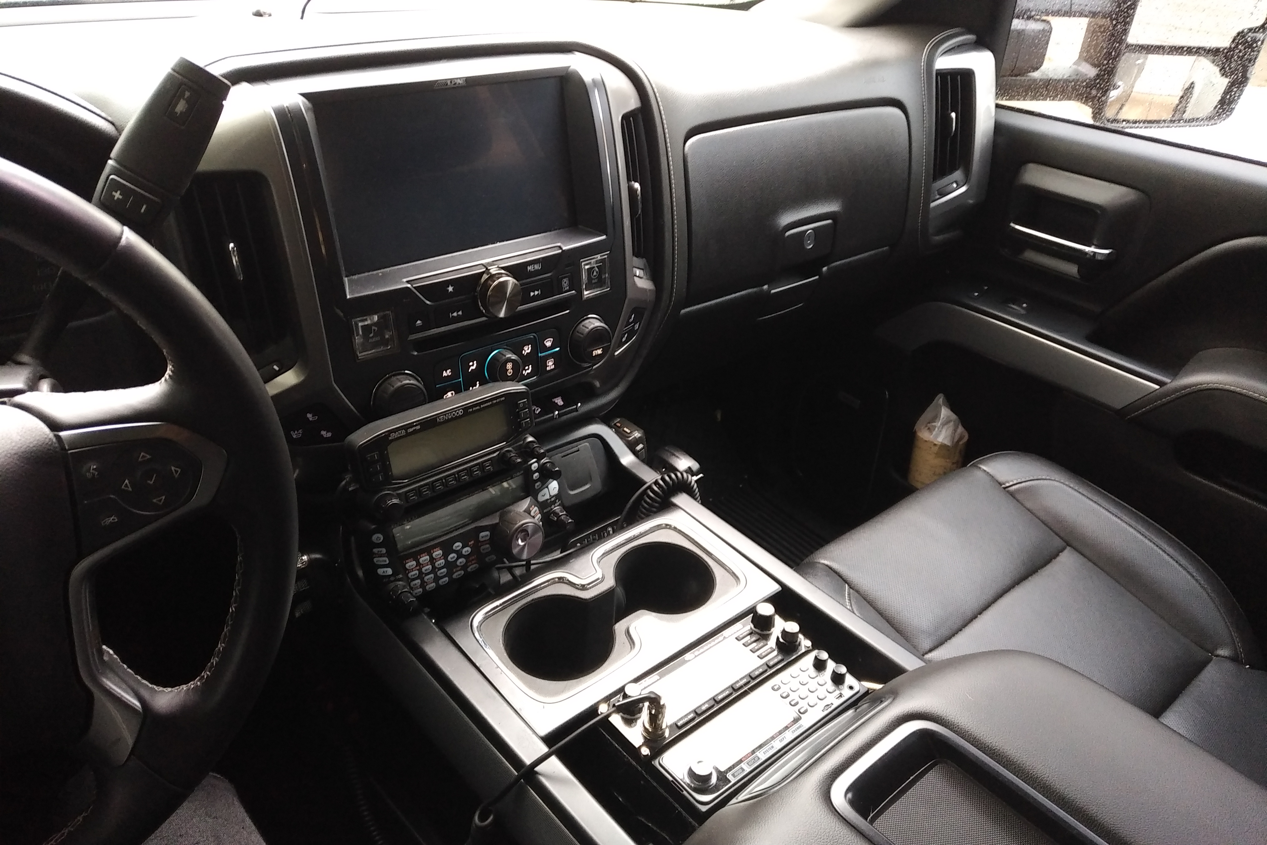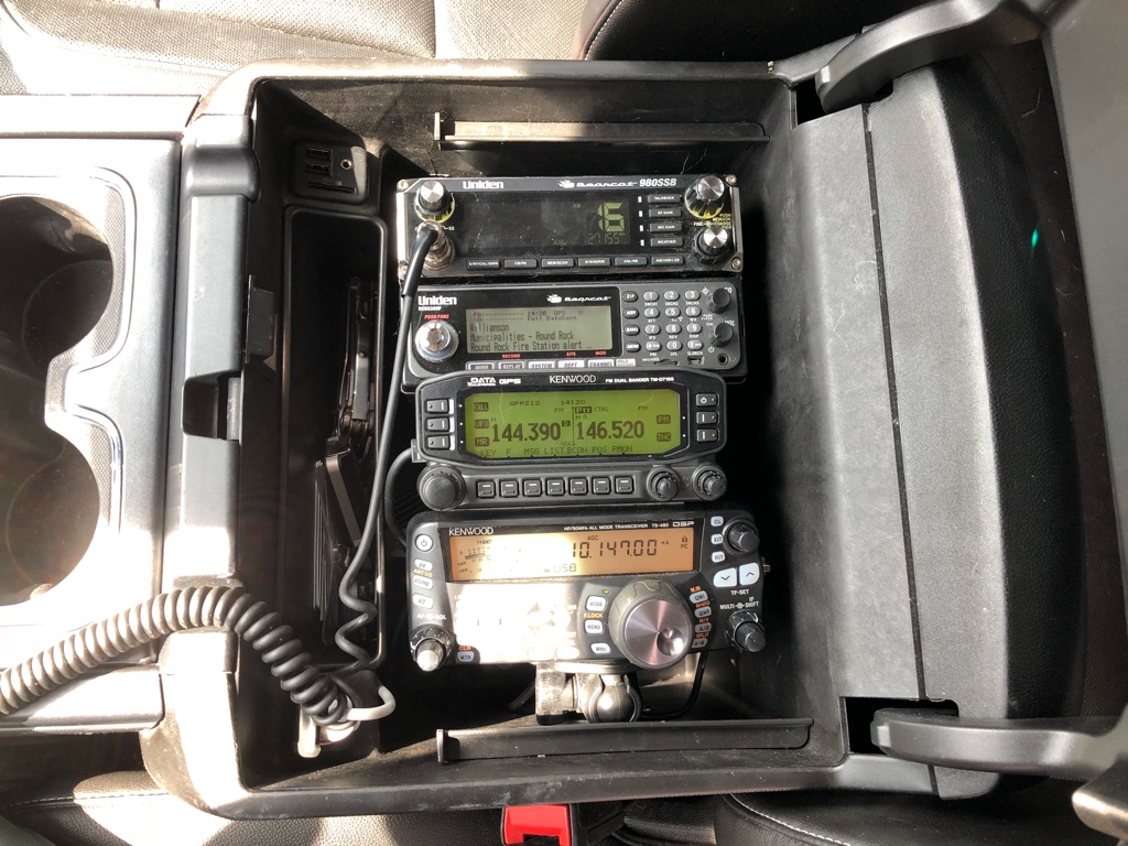 I moved all the radios into the closing center console compartment, which frees up the center console for storage and allows free access to all of the accessory buttons under the radio. I also moved the CTS2 into the console using a ProMounts mounting kit I found online. The two ham radios are connected using both automotive exterior attachment tape and some scrap aluminum that I cut and drilled in order to create a makeshift mount, that is ultimately tied to a RAM mount. I can still use the storage area under the radios, but it’s difficult to get to, so reserved for large, rarely accessed items. All of the wiring comes up through the bottom and I cut out the bottom panel, which is easily replaceable if I ever want to back out these changes in the future, in order to allow the wires to pass through.
