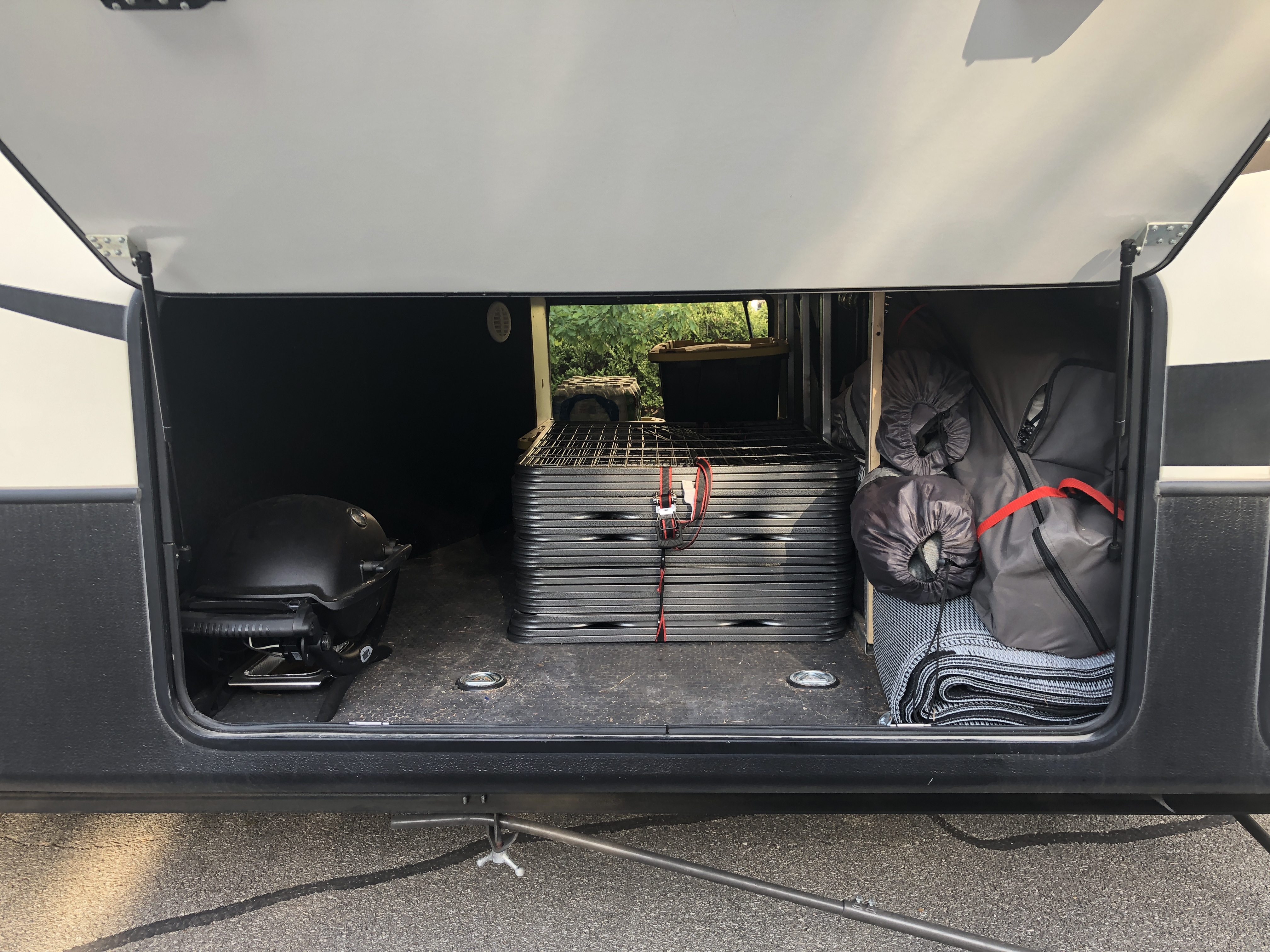 While it was here, I replaced the Anderson 4-way valve cartridge and one of the toilet’s flushing mechanisms, both due to leaks. We had a hard freeze over the winter that damaged both of them, and because we don’t usually have freezes like that here, the RV wasn’t properly winterized. I ordered spares as well. Then I moved on to the underbody storage. I pulled everything out of it and lumped it into a huge pile in the garage. The pass through storage had inflatable kayaks, paddleboards, a telescope, and all sorts of things we thought we would use often but rarely did. I went to Home Depot and bought a few plastic totes to organize the remaining items and then stacked our new fence in there.